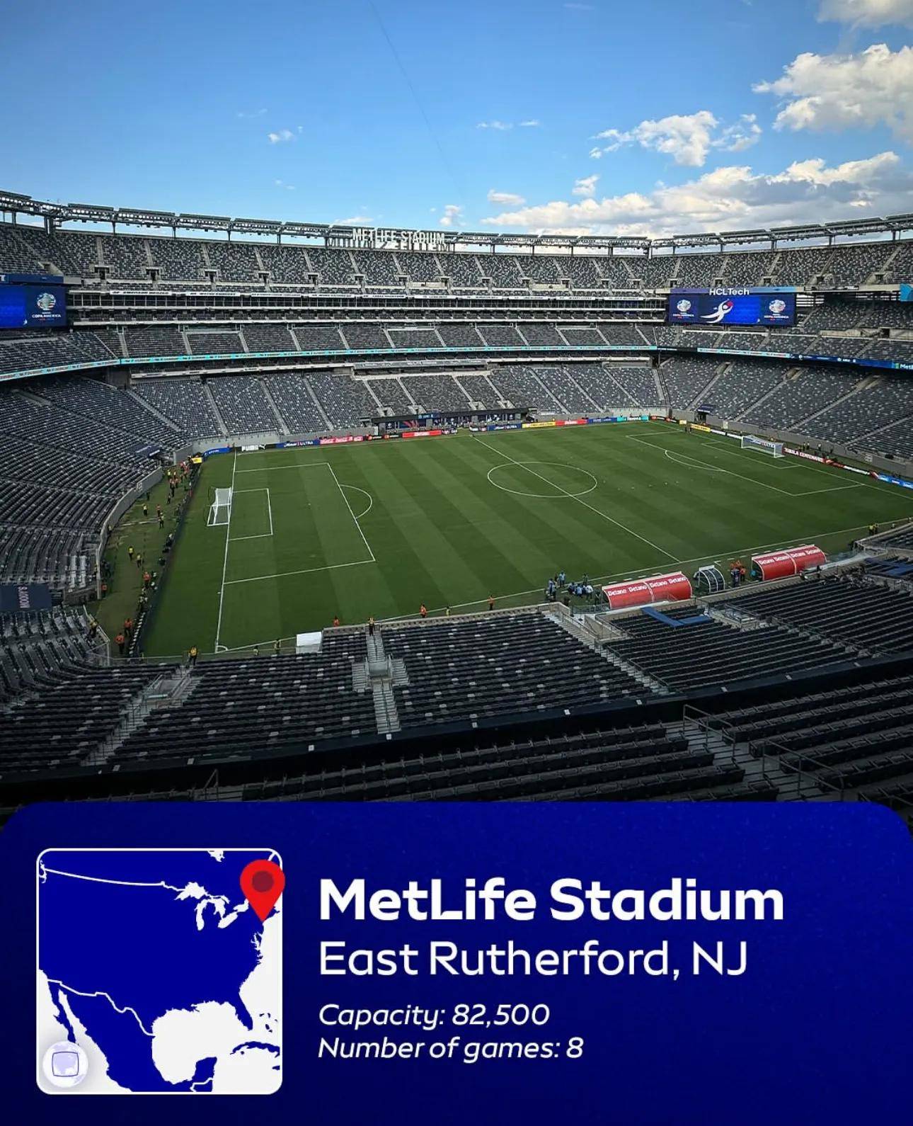 MetLife Stadium (东卢瑟福,新泽西州,美国): 坐落于纽约都会区的MetLife Stadium,拥有82,500个座位,将承办8场比赛。作为东海岸最重要的赛场之一,这座现代化的露天球场不仅交通便利,更坐拥庞大的球迷市场,势必将掀起一股足球热潮。