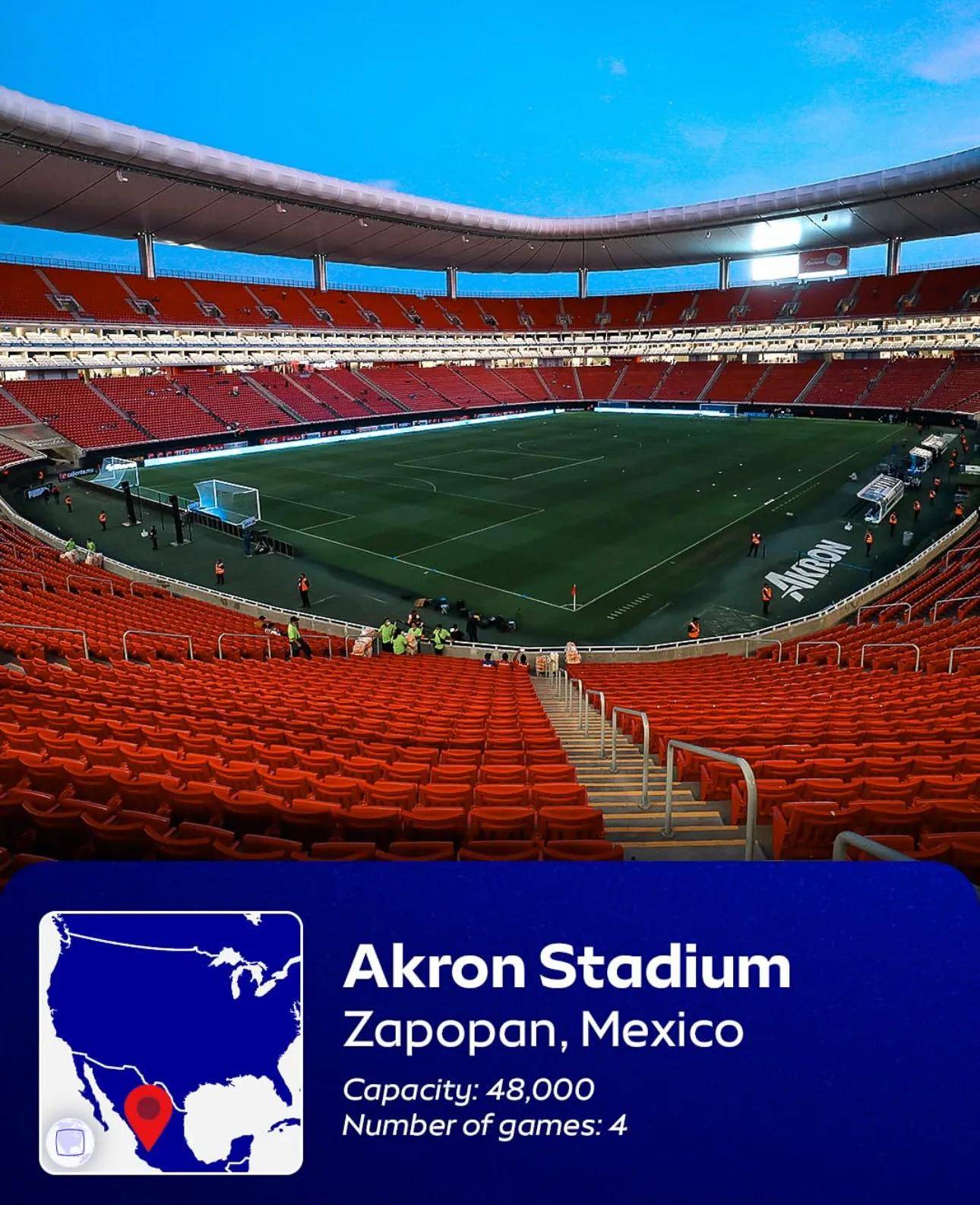 Akron Stadium (萨波潘,墨西哥): 这座位于瓜达拉哈拉都会区的现代化体育场,是墨西哥的第三个赛场,容量为48,000人,将承办4场比赛。