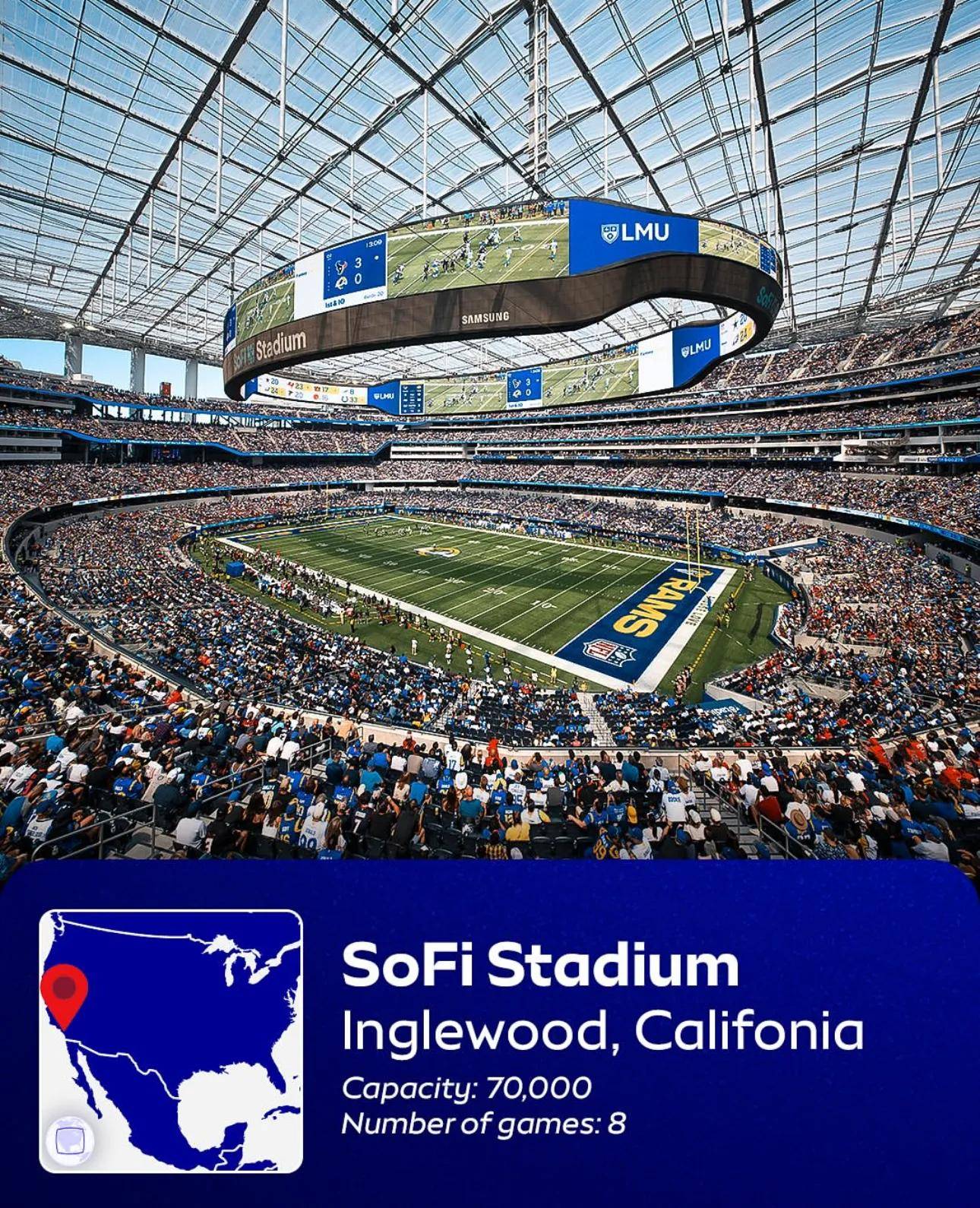 SoFi Stadium (英格尔伍德,加利福尼亚州,美国): 位于洛杉矶地区的SoFi Stadium,拥有70,000个座位,同样承办8场比赛。这座场馆最大的特色在于其半透明的固定屋顶,以及巨大的椭圆形中央屏幕,为球迷打造身临其境的观赛体验。