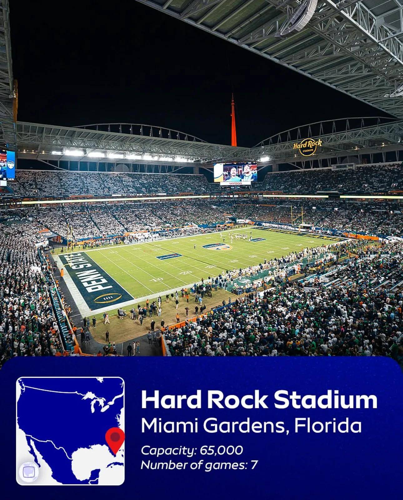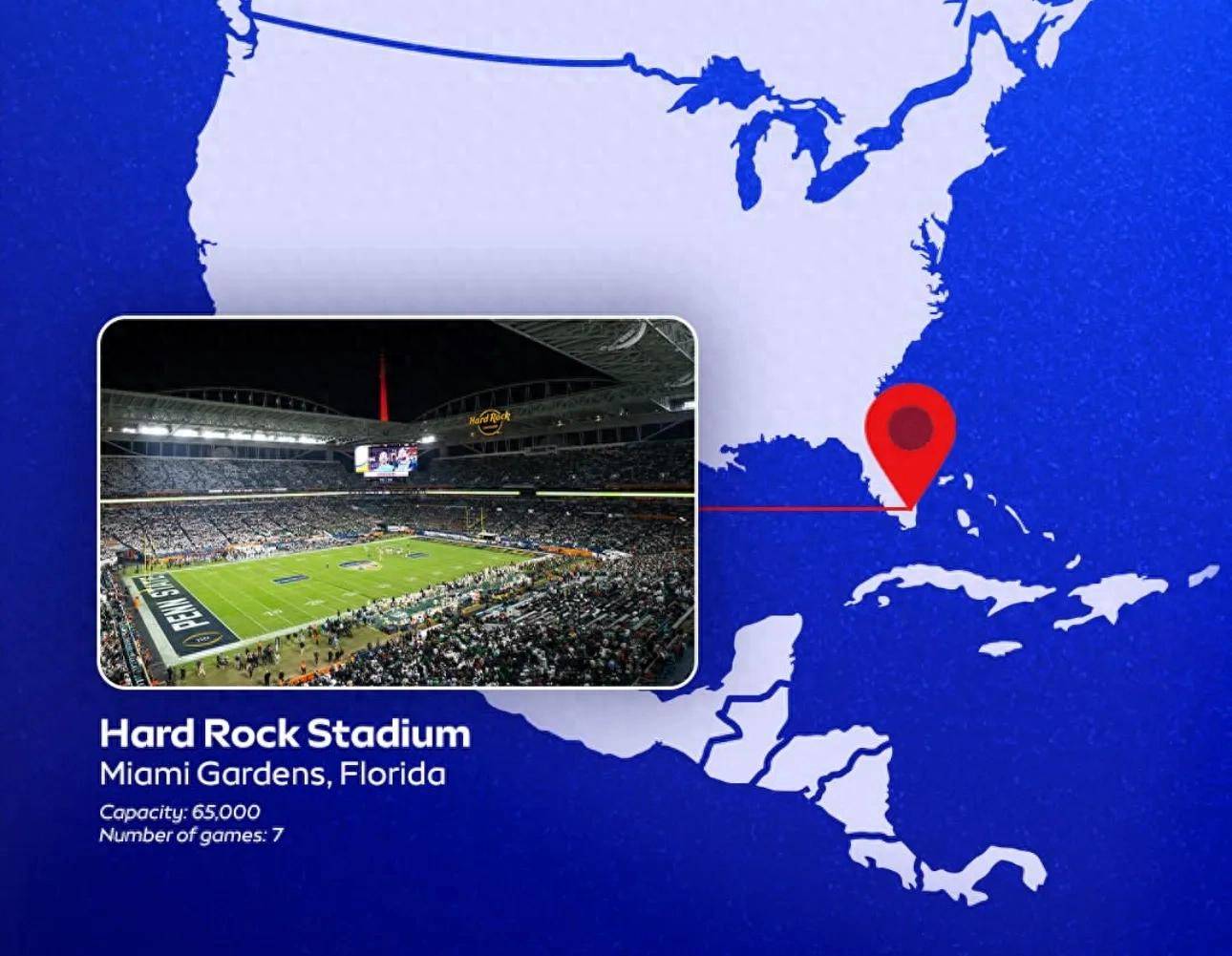 Hard Rock Stadium (迈阿密花园,佛罗里达州,美国): 位于旅游胜地迈阿密的硬石体育场,同样拥有65,000个座位,并将承办7场比赛。其部分顶棚覆盖的设计,为球迷提供了更加舒适的观赛环境。