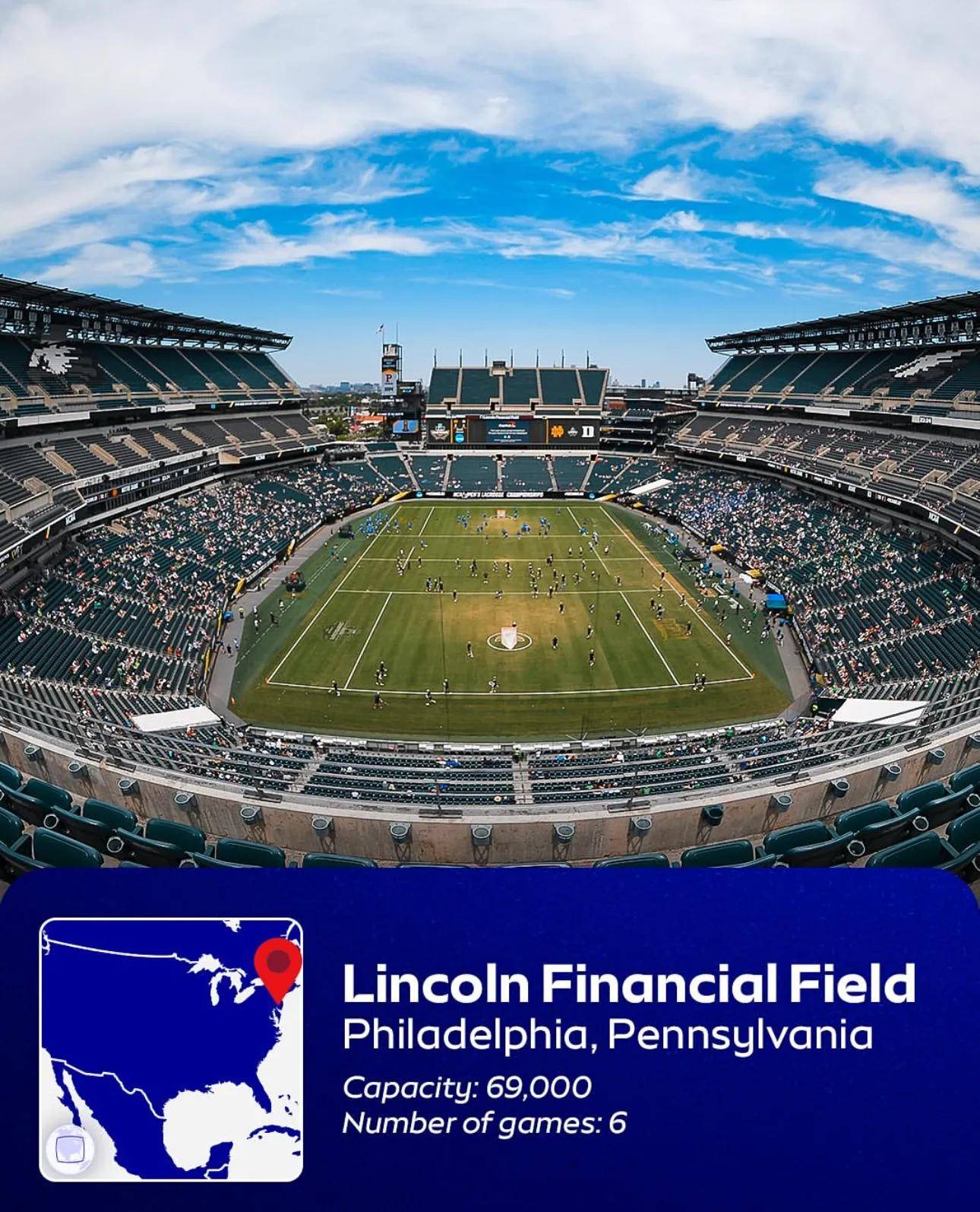 Lincoln Financial Field (费城,宾夕法尼亚州,美国): 这座位于美国东北部历史名城的露天球场,为球迷提供了方便的观赛地点,拥有69,000个座位,将承办6场比赛。