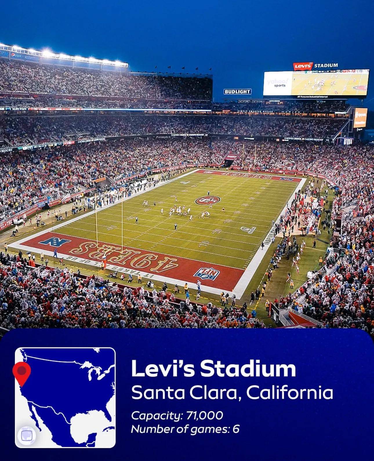 Levis Stadium (圣克拉拉,加利福尼亚州,美国): 作为位于旧金山湾区的现代化露天场馆,李维斯体育场气候宜人,拥有71,000个座位,将承办6场比赛。