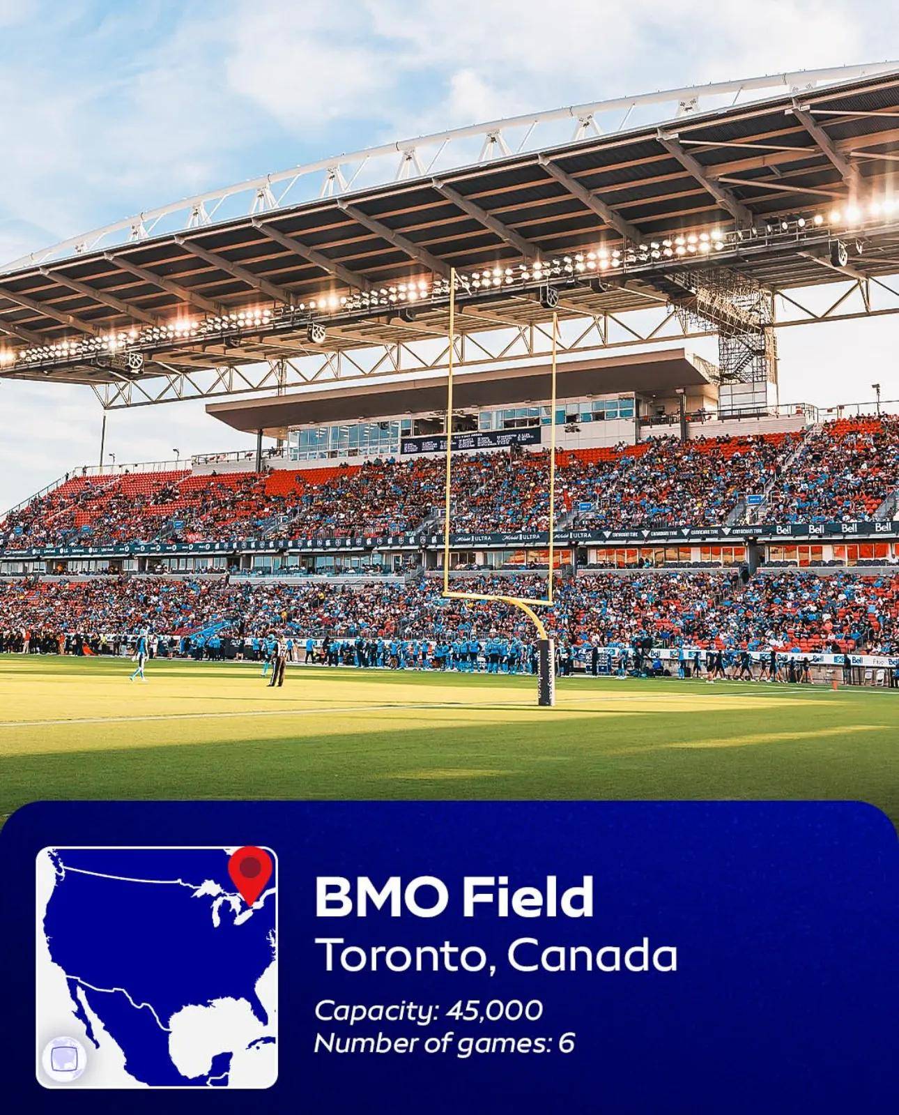 BMO Field (多伦多,加拿大): 作为所有场馆中容量最小的场馆,BMO Field拥有45,000个座位。这座亲密的露天足球场,代表了加拿大对本届世界杯的贡献,将承办6场比赛。