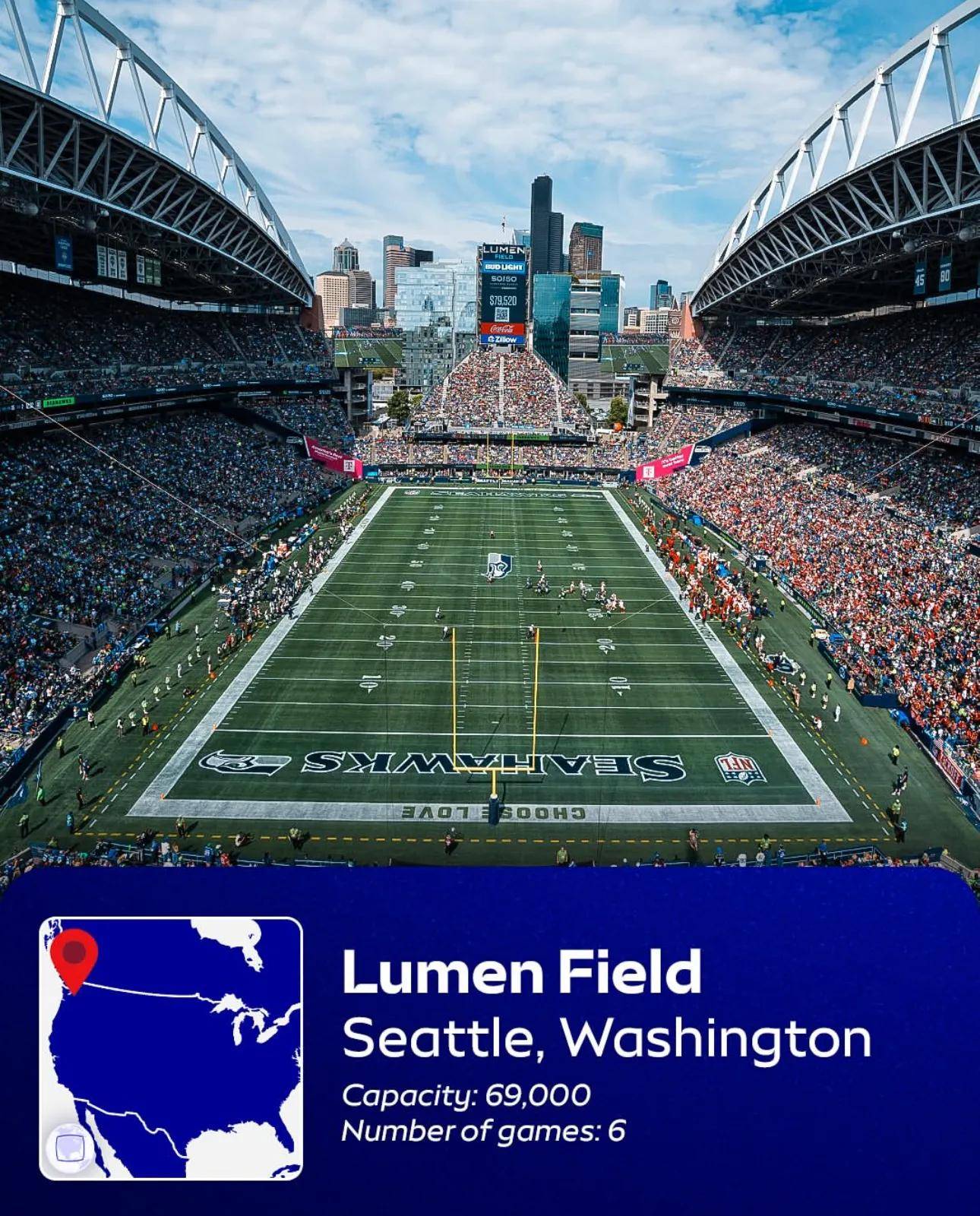 Lumen Field (西雅图,华盛顿州,美国): 卢门球场以其紧凑的碗状设计而闻名,位于西雅图的城市天际线背景下,球迷的激情非常高昂,拥有69,000个座位,将承办6场比赛。