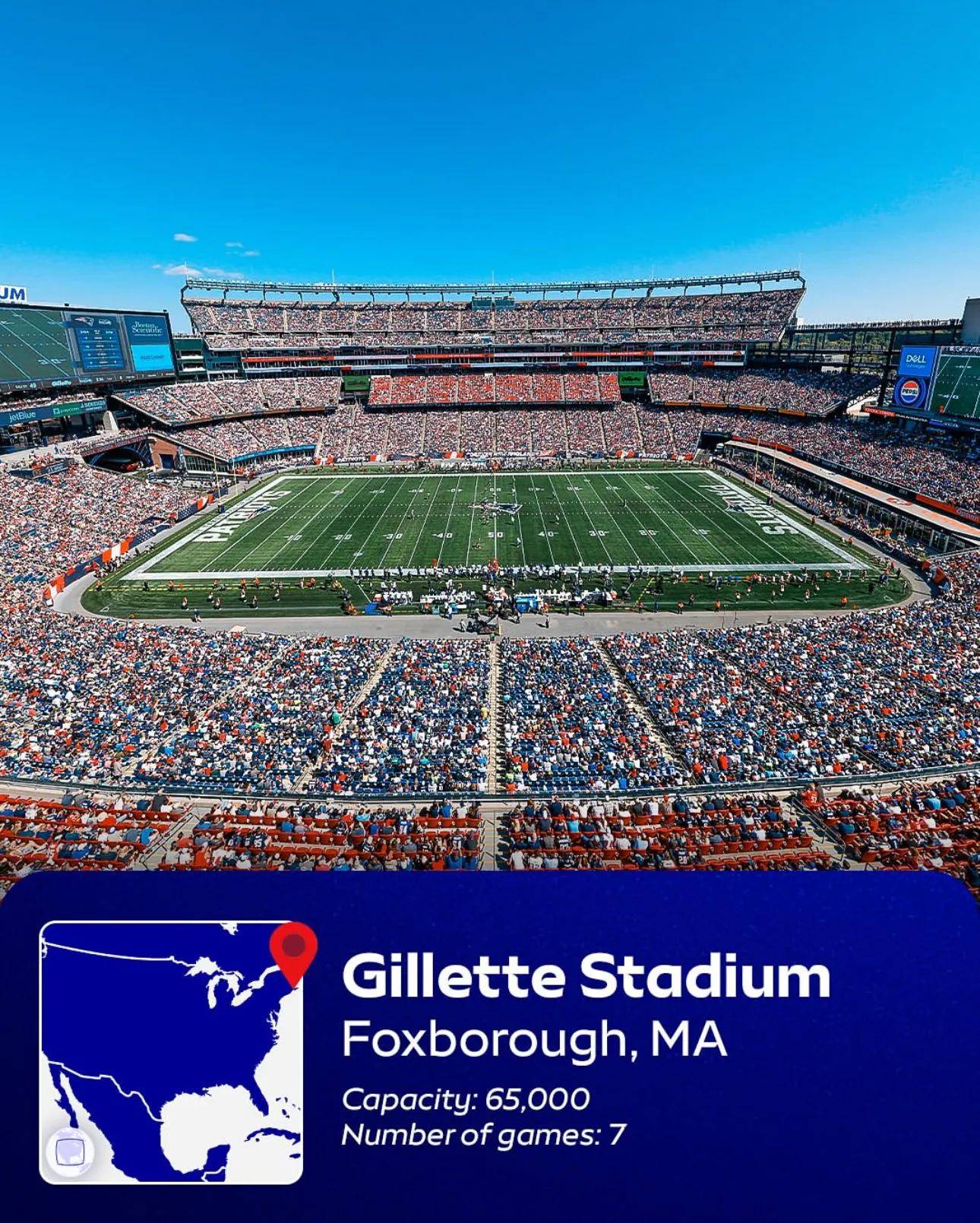 Gillette Stadium (福克斯堡,马萨诸塞州,美国): 位于波士顿都会区的新英格兰爱国者队主场吉列体育场,是一座经典的露天美式足球场,拥有65,000个座位,将承办7场比赛。
