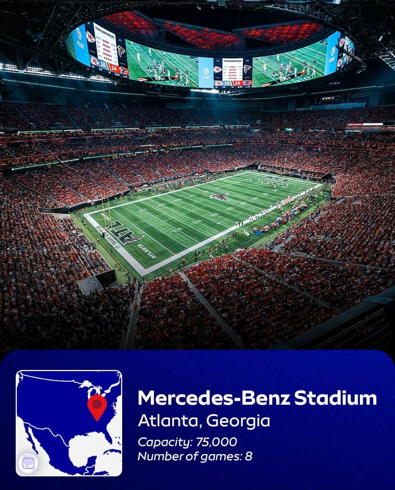 Mercedes-Benz Stadium (亚特兰大,佐治亚州,美国): 亚特兰大的Mercedes-Benz Stadium,拥有75,000个座位,也将举办8场比赛。这座场馆的设计极具未来感,其可伸缩屋顶和独特的环形LED计分板,是现代化体育场馆设计的典范。