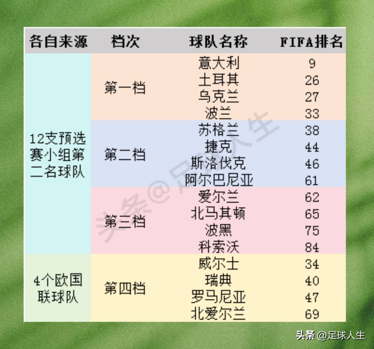 注:若威尔士末轮反超北马其顿,那么威尔士将挤掉阿尔巴尼亚成为第二档球队,阿尔巴尼亚掉至第三档,北马其顿将通过欧国联资格参赛并进入第四档。