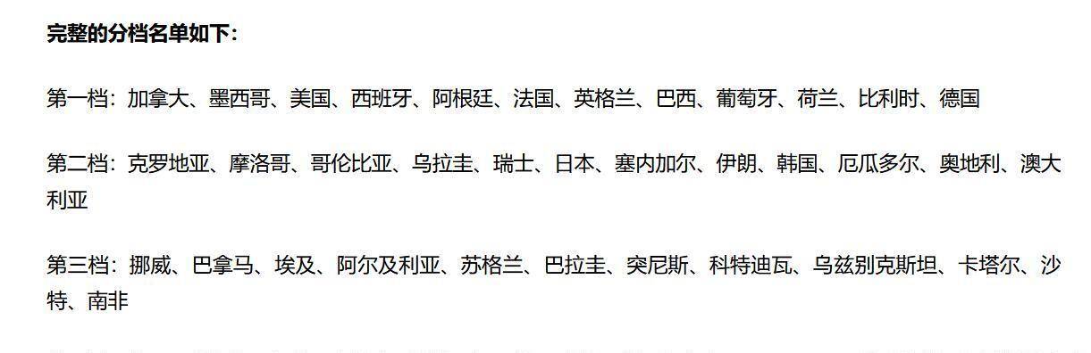 根据全新的分档规则,三个联合东道主美国、加拿大和墨西哥自动进入了第一档球队。 其他球队按照世界排名等因素分成了四个档次。 每个小组会有四支球队。