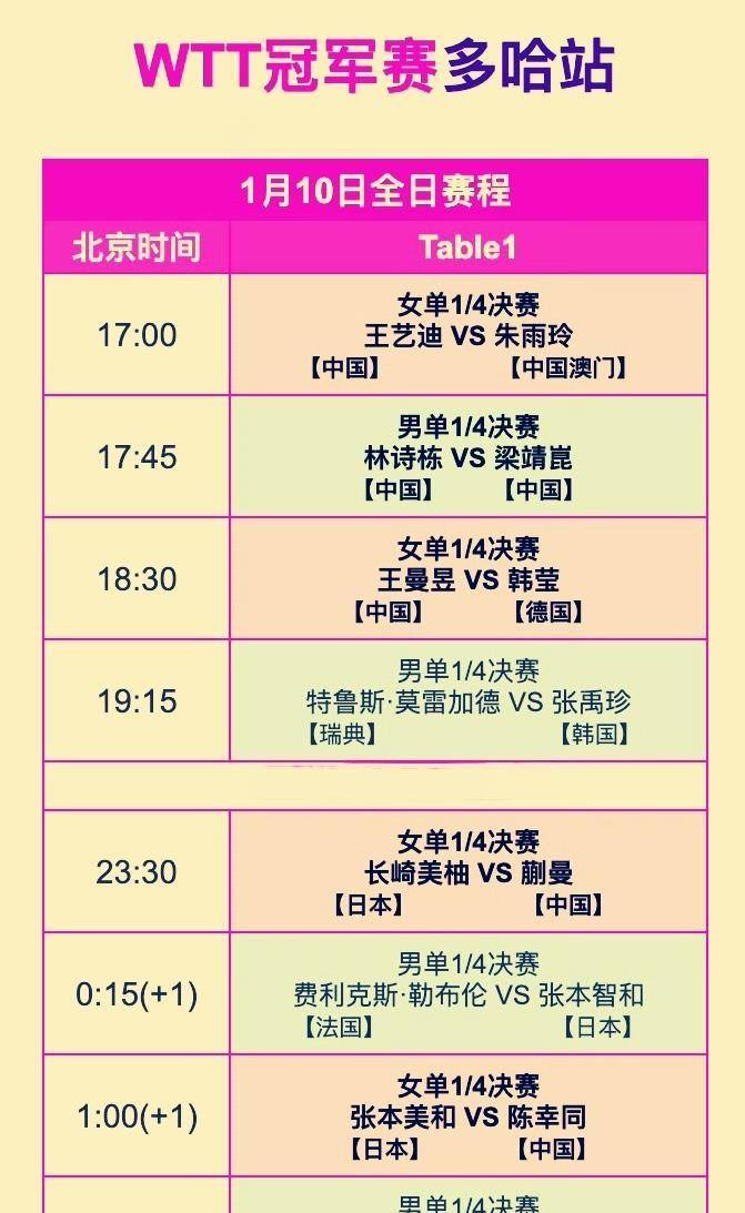2026世界杯赛程,世界杯球队,足球预测,世界杯投注,赛事直播北京时间1月10日,WTT多哈冠军赛迎来最关键阶段。 随着1/8决赛在凌晨时分全部结束,男女单打八强名单正式出炉。 国乒女队四名选手全部晋级,展现出冲击四强全包揽的强大实力;而男队仅存林诗栋和梁靖崑两位选手,却要在四分之一决赛提前上演内战,注定只有一人能够晋级半决赛。
