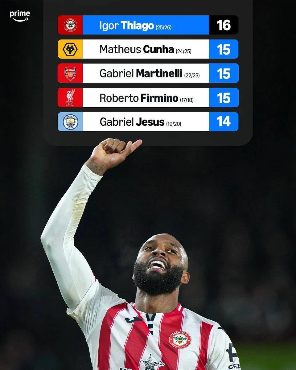 上轮英超比赛,布伦特福德客场4-2击败埃弗顿,伊戈尔-蒂亚戈上演帽子戏法,让个人的赛季进球数达到了14球,距离巴西球员单赛季英超最多进球纪录只差1球。本轮面对桑德兰,伊戈尔-蒂亚戈依旧状态火热, 他在上下半场各入一球,直接将个人进球数据提升至16球。